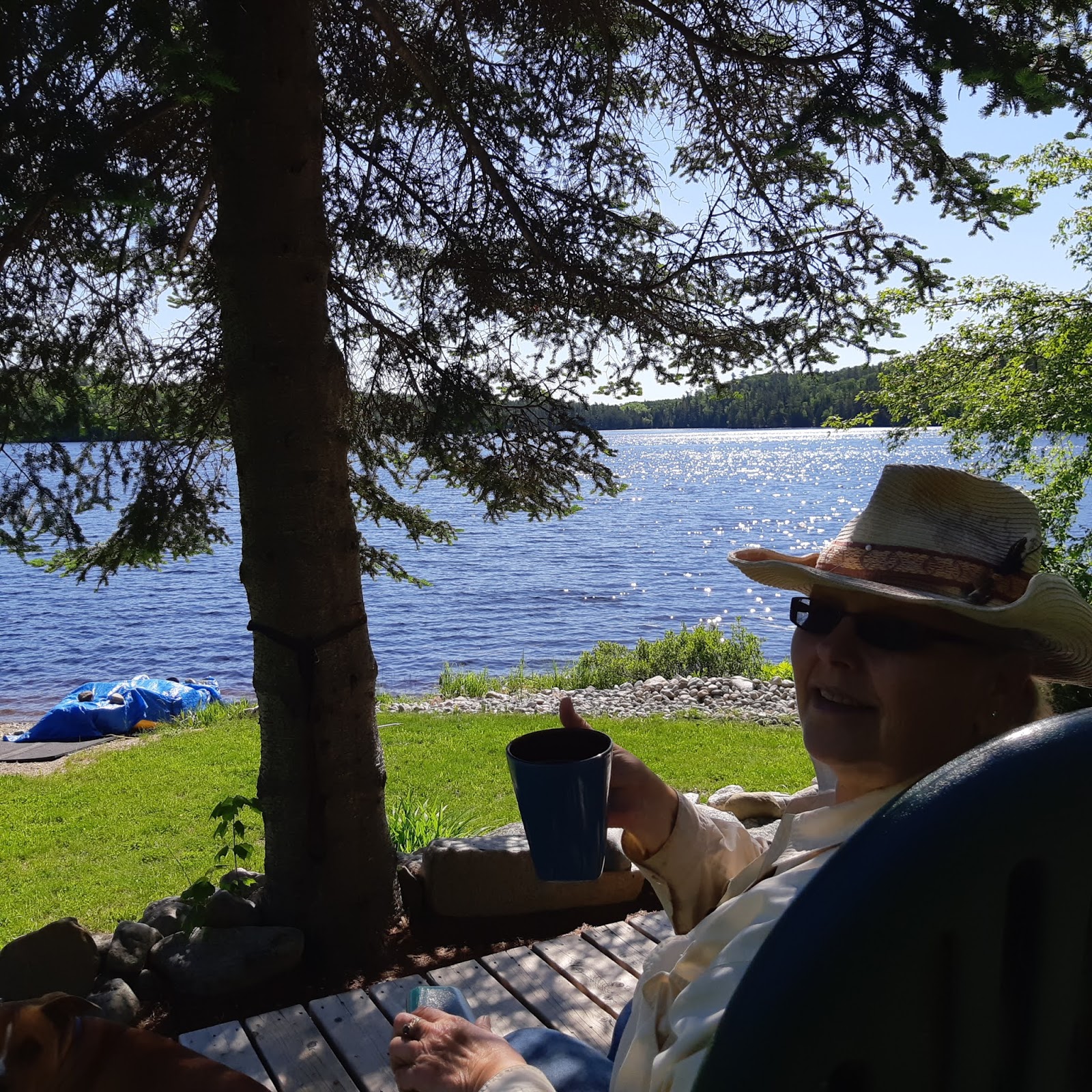 Well, here is our version of porching. We built a small deck by the water, perched up into the end of an old road bed. A huge balsam fir provides shade and a little privacy .